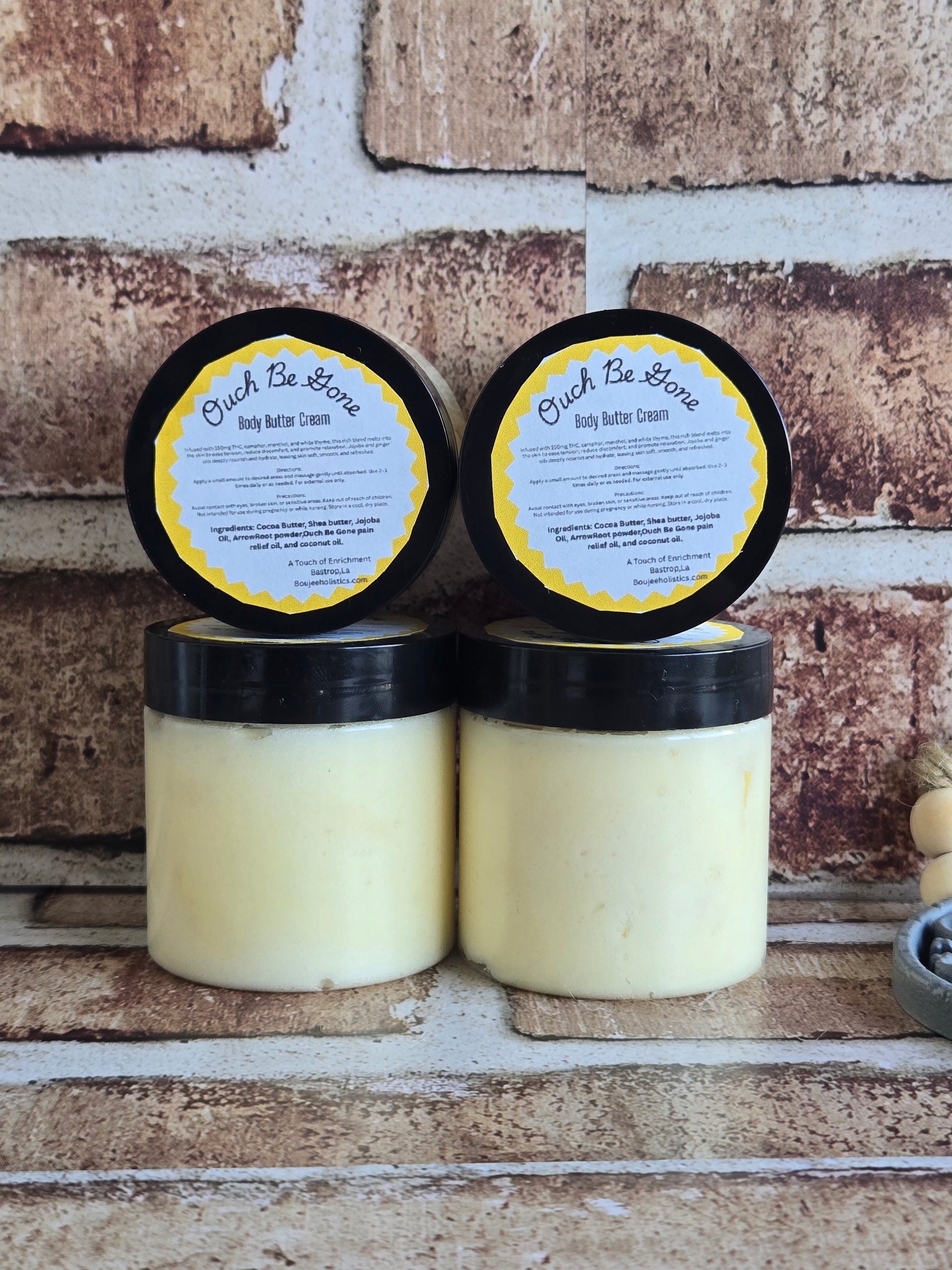 Creamy Body Butter infused in Ouch Be Gone pain relief oil.